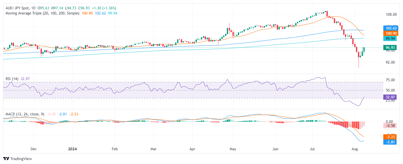- AUD/JPY bulls pushed the pair higher to 96.80 on Thursday, extending its recovery.