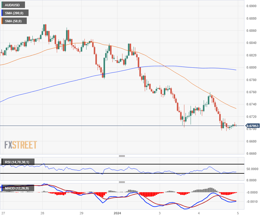The AUD/USD is trading on the bottom side of the 200-hour Simple Moving Average (SMA), running aground of the 0.6700 handle as near-term momentum pins firmly into the bearish side with a downside cross of the 50-hour and 200-hour SMAs near 0.6800 acting as a short-term technical ceiling.
