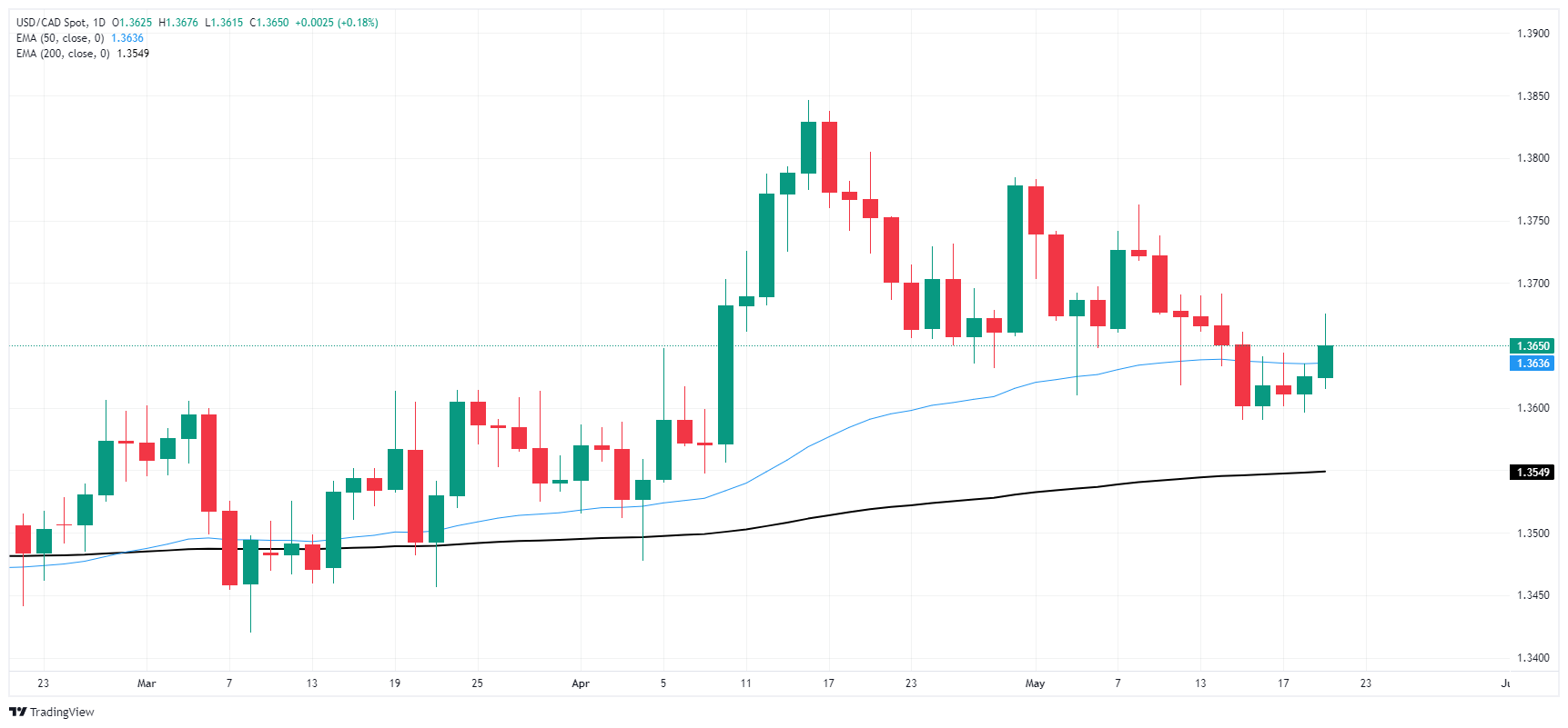 USD/CAD rose to its highest bids in a week, threatening to solidify a bullish rejection from the 50-day Exponential Moving Average (EMA) from 1.3636. The pair is still down from last month’s peak bids near 1.3850, but a long-term technical floor is priced in at the 200-day EMA from 1.3549.