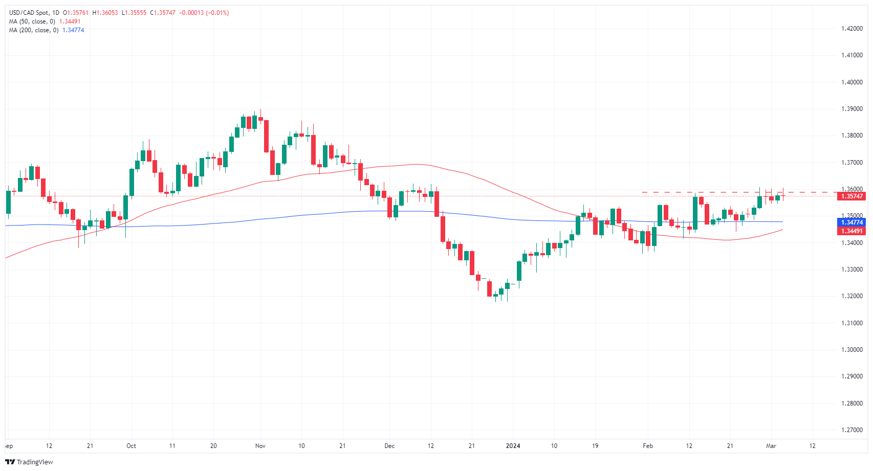 USD/CAD continues to knock into the 1.3600 handle as daily candles pull into congestion. The pair continues to find support above the 200-day Simple Moving Average (SMA) at 1.3477.