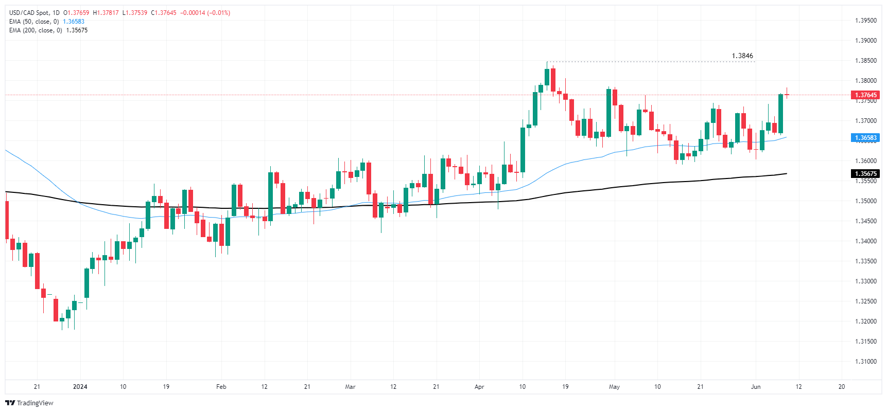 The 1.3780 level is the target for intraday buyers to beat, while short positions will need to accumulate enough pressure to drive bids back to the 1.3700 handle. A lack of trend is plaguing USD/CAD with the pair up 3.9% in 2024 but remaining down from the year’s peak bids at 1.3846 set back in mid-April.