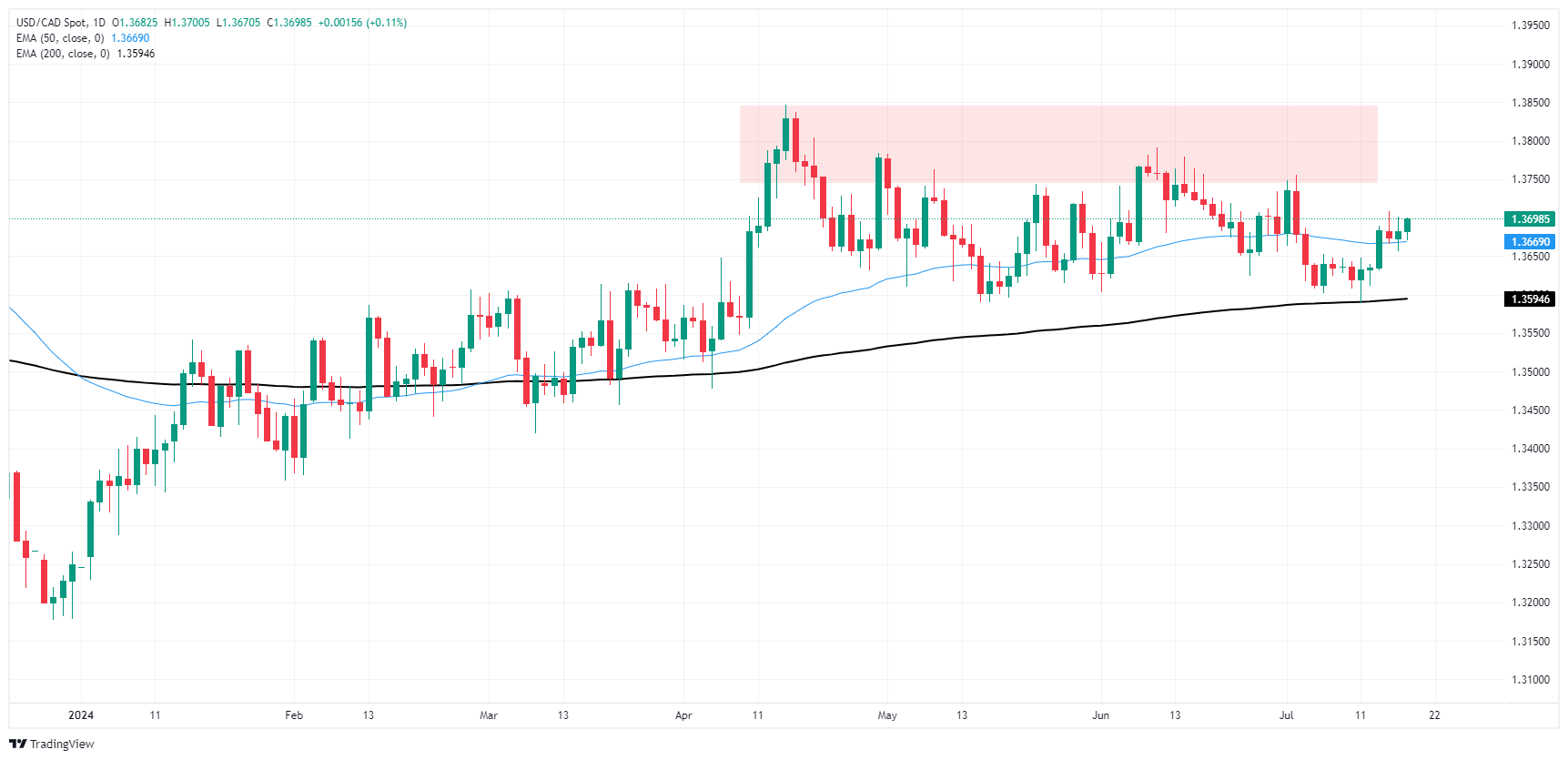 A thin recovery from Wednesday’s dip below the 50-day Exponential Moving Average (EMA) at 1.3670 may have short legs, but a small recovery is still a recovery and USD/CAD continues to battle with the 1.3700 level. Intraday price action found a floor at the 200-hour EMA at 1.3663, and daily candles are poised to continue a bullish recovery after bids bottomed out at the 200-day EMA near 1.3595 last week.