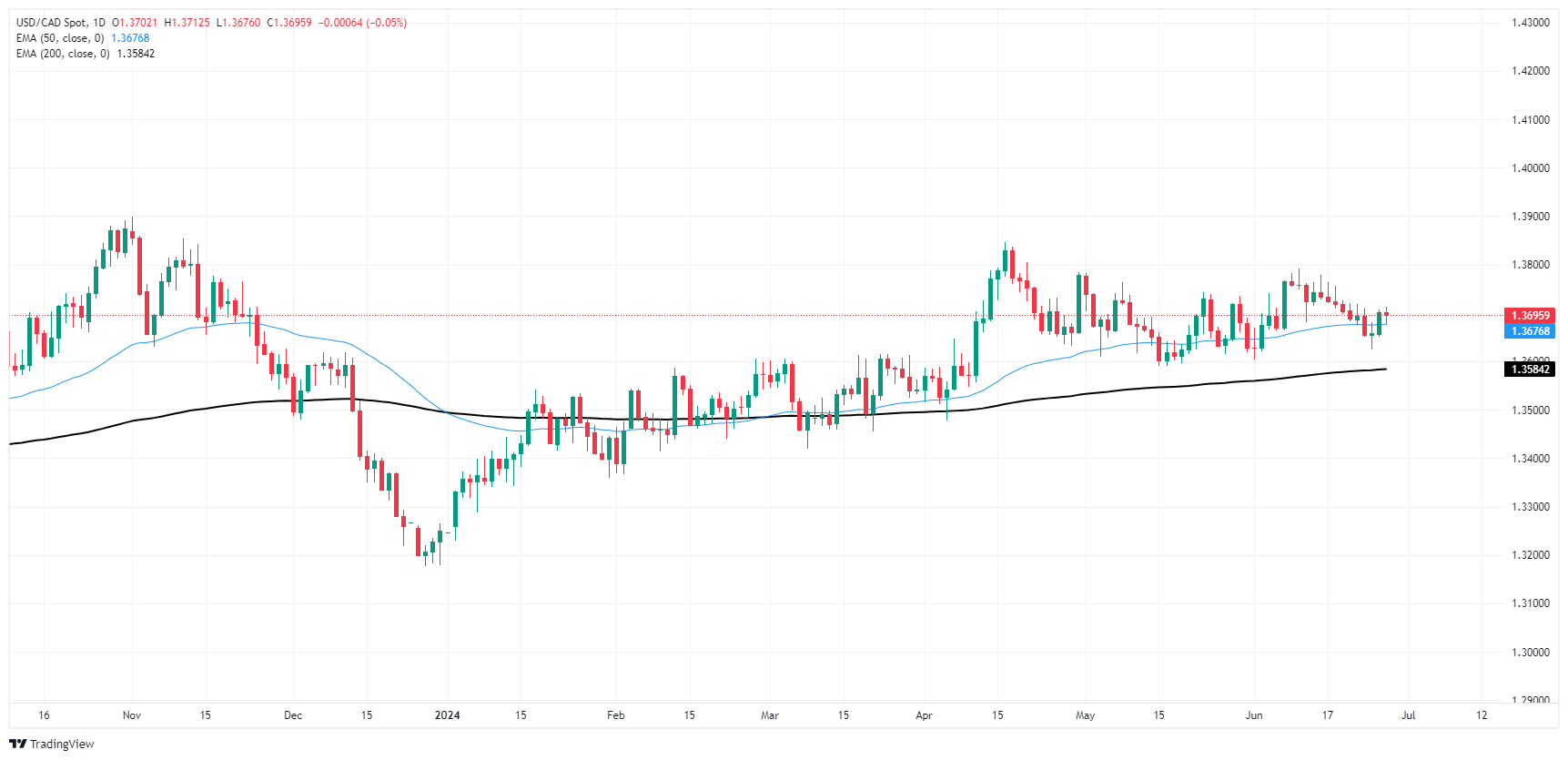 USD/CAD is stuck close to Thursday’s opening bids after an early dip to 1.3680. The pair remains stuck in a price action trap near the 1.3700 handle as intraday bids get hung up on the 200-hour Exponential Moving Average (EMA) at 1.3692.