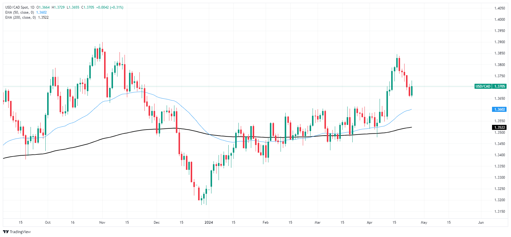 The USD/CAD has risen back above the 1.3700 handle, testing chart territory north of the 200-hour Exponential Moving Average (EMA) near 1.3715. The pair bounced off the 1.3660 level to pare away Tuesday’s declines.