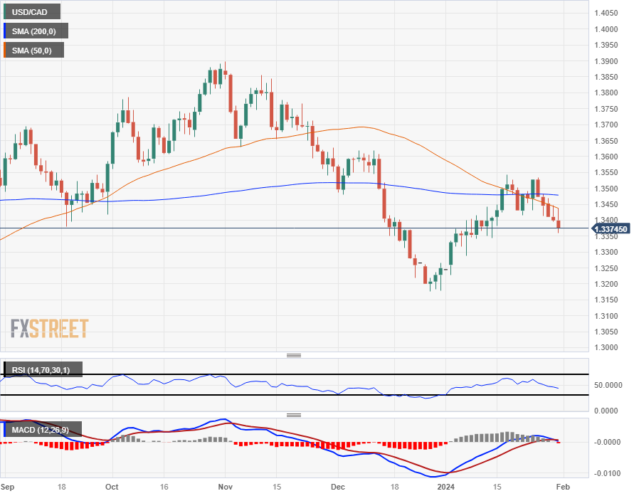 If the Canadian Dollar achieves a bullish close against the US Dollar on Wednesday, the USD/CAD will etch in its fifth consecutive down day as the pair pulls away toward the downside from the 200-day Simple Moving Average (SMA) near the 1.3500 handle.