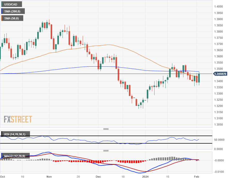 USD/CAD surged back above the 200-hour Simple Moving Average (SMA) near 1.3443, and the pair tested into the 1.3480 neighborhood on Friday.