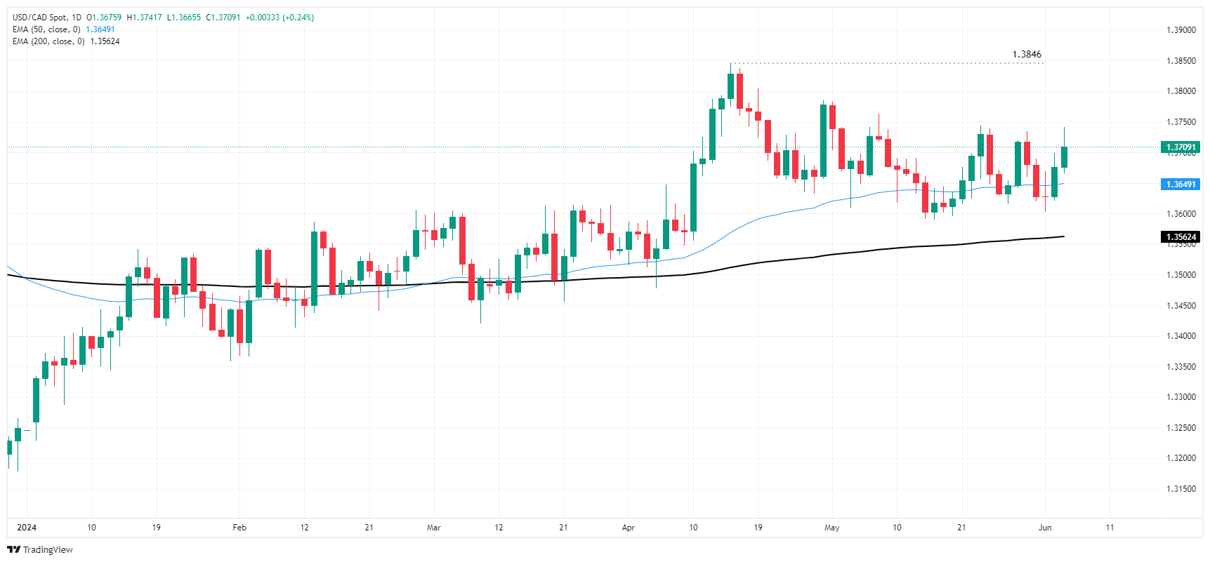 The Canadian Dollar (CAD) backslid against the US Dollar (USD) during Wednesday’s US market session, briefly sending USD/CAD to a near-term high of 1.3740 before markets faded the move back to the 1.3700 handle. The Bank of Canada (BoC) delivered a broadly expected quarter-point rate cut, but US ISM Services Purchasing Managers Index (PMI) figures in June unexpectedly rose to a nine-month high.
