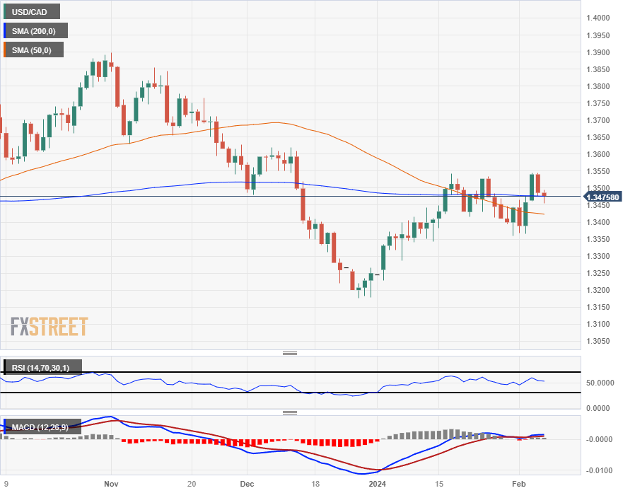 Daily candlesticks have the USD/CAD trading firmly into the 200-day Simple Moving Average (SMA) near 1.3475, and the pair is at risk of tipping back into a congestion zone between the 50-day and 200-day SMAs as long-term trends drift into a consolidation trap.