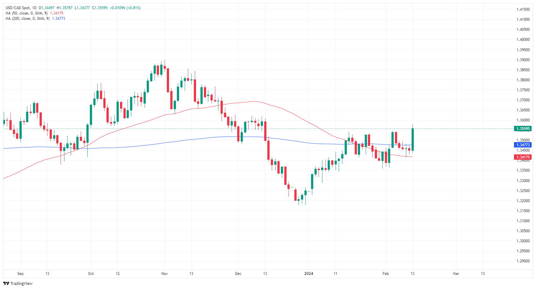 The USD/CAD surged to an eight-week high on Tuesday, hitting a near-term high of 1.3578. The pair surged over a full percent bottom-to-top on the day, easily reclaiming the 1.3500 handle.