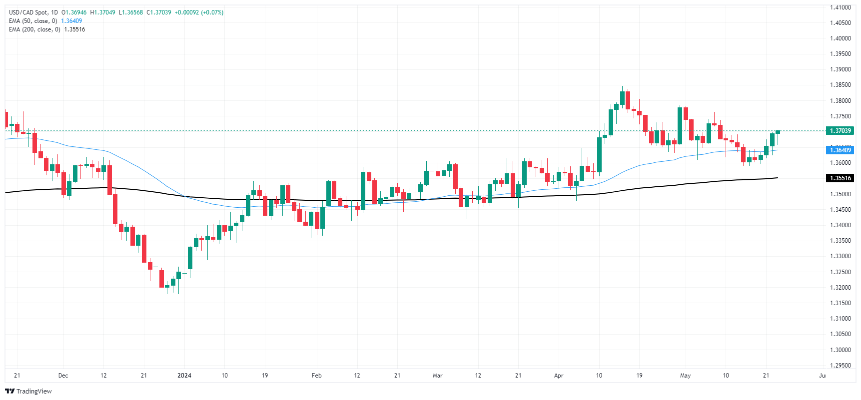 USD/CAD rose to the 1.3700 handle on Thursday as the mixed-performance Greenback outpaces the softening Canadian Dollar. The pair has risen into a two-week high and is on pace to close higher for a fourth straight day. Four of the last five daily candles have closed in the green.