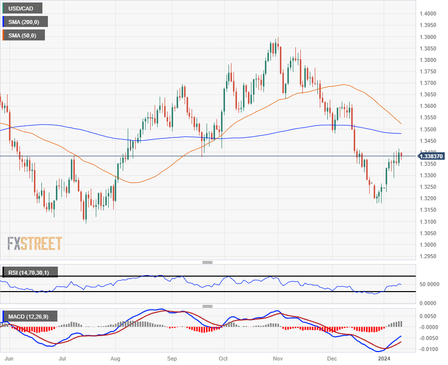 The USD/CAD pair is swamped just below 1.3400, with intraday pressure skewing to the downside as the Loonie-Greenback pairing middles. Near-term price action remains buoyed by the 200-hour Simple Moving Average (SMA) near 1.3325, and bidders will be looking for continued support from a pattern of intraday higher lows driving the pair into the top end in early 2024 trading.