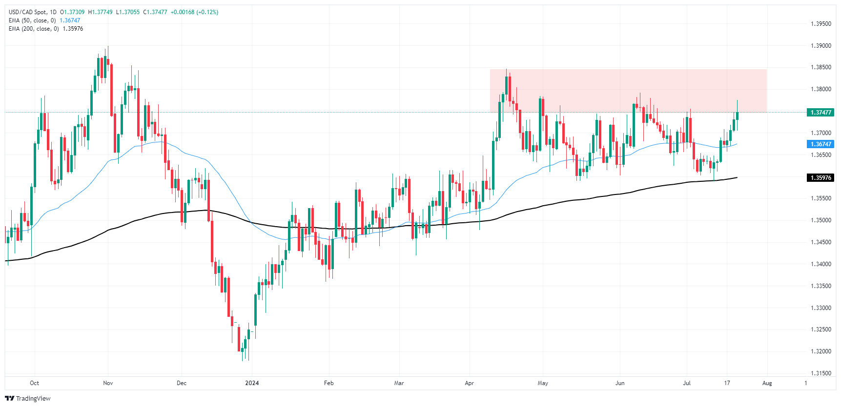 USD/CAD continues to grind its way back towards 1.3800, and the pair is on pace to close Monday in the green after an early tease towards the 1.3700 handle. The pair has closed bullish for all but one of the last seven consecutive trading days, and is set to chalk in day number eight as bidders grapple with 1.3750.