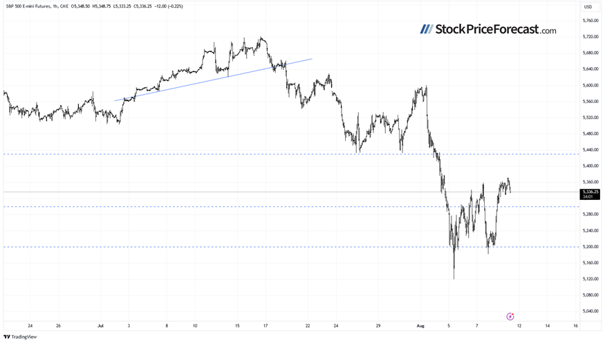 Let’s take a look at the hourly chart of the S&P 500 futures contract. On Monday it traded as low as 5,120, rebounded to around 5,360 on Wednesday, then pulled back below 5,200 before rebounding to a local high of around 5,370 this morning.