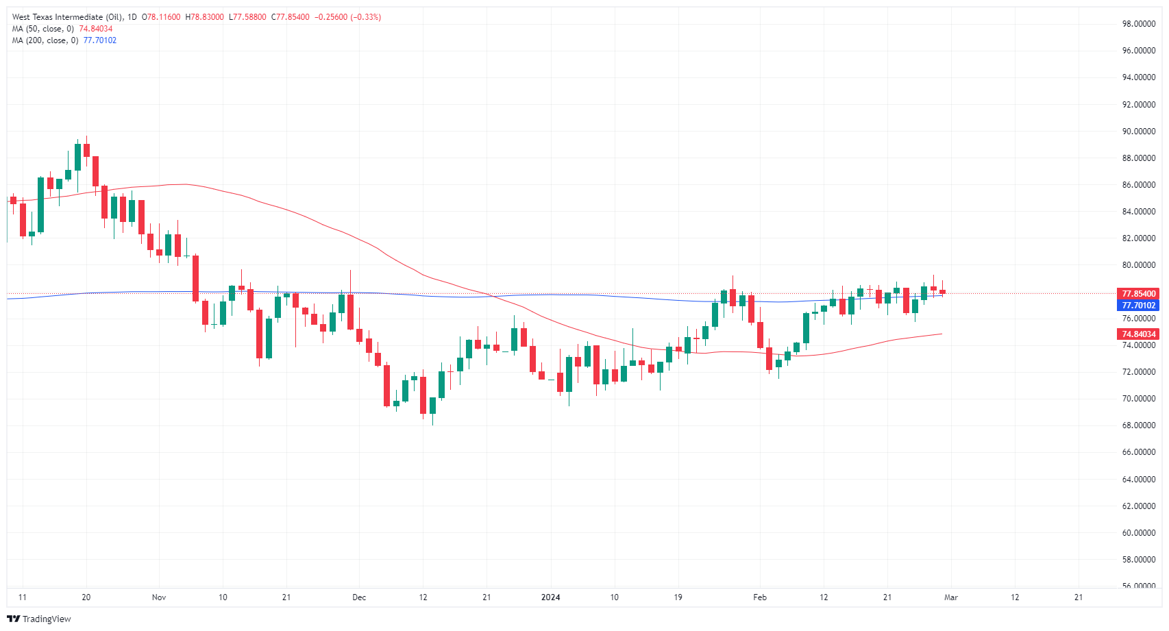 West Texas Intermediate (WTI) US Crude Oil traded closely with the $78.00 handle on Thursday as bullish Crude Oil momentum stopped in its tracks as rising US Crude Oil stocks begin to weigh on energy risk appetite. US Personal Consumption Expenditure (PCE) inflation came in at expectations but failed to spark renewed hopes for Federal Reserve (Fed) rate cuts.