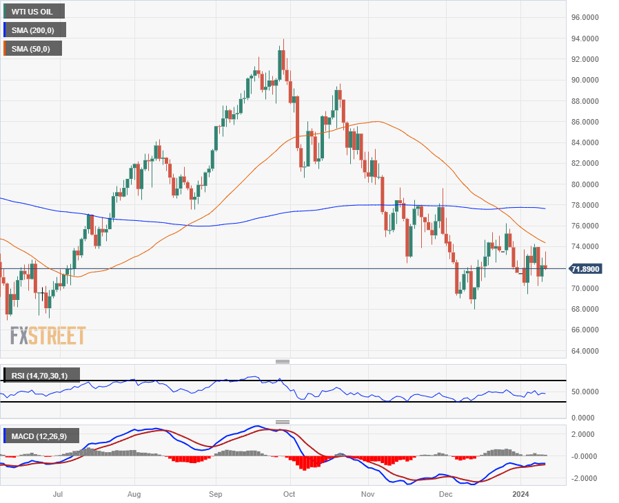 WTI US Crude Oil stumbled back from Wednesday’s peak bids near $73.60 to retest the $72.00 handle as bids continue to get hampered by the 200-hour Simple Moving Average (SMA). Rough chop on the intraday level continues to be the name of the game, with WTI prices whipsawing in a rough range in the early weeks of 2024.