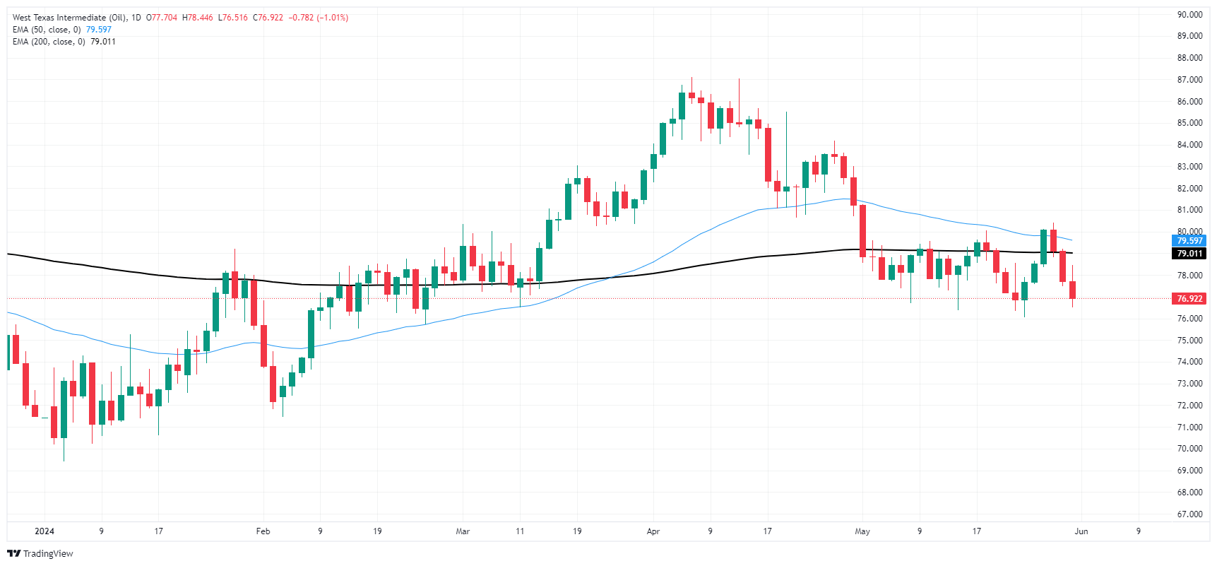 WTI fell to a fresh weekly low of 76.50 on Friday, sending barrels into the red for the week and securing a second month of declines in US Crude Oil. WTI rose to an intraday high near $78.40 on Friday, but tumbled after knocking on the 200-hour Exponential Moving Average (EMA) which is descending into $78.30.
