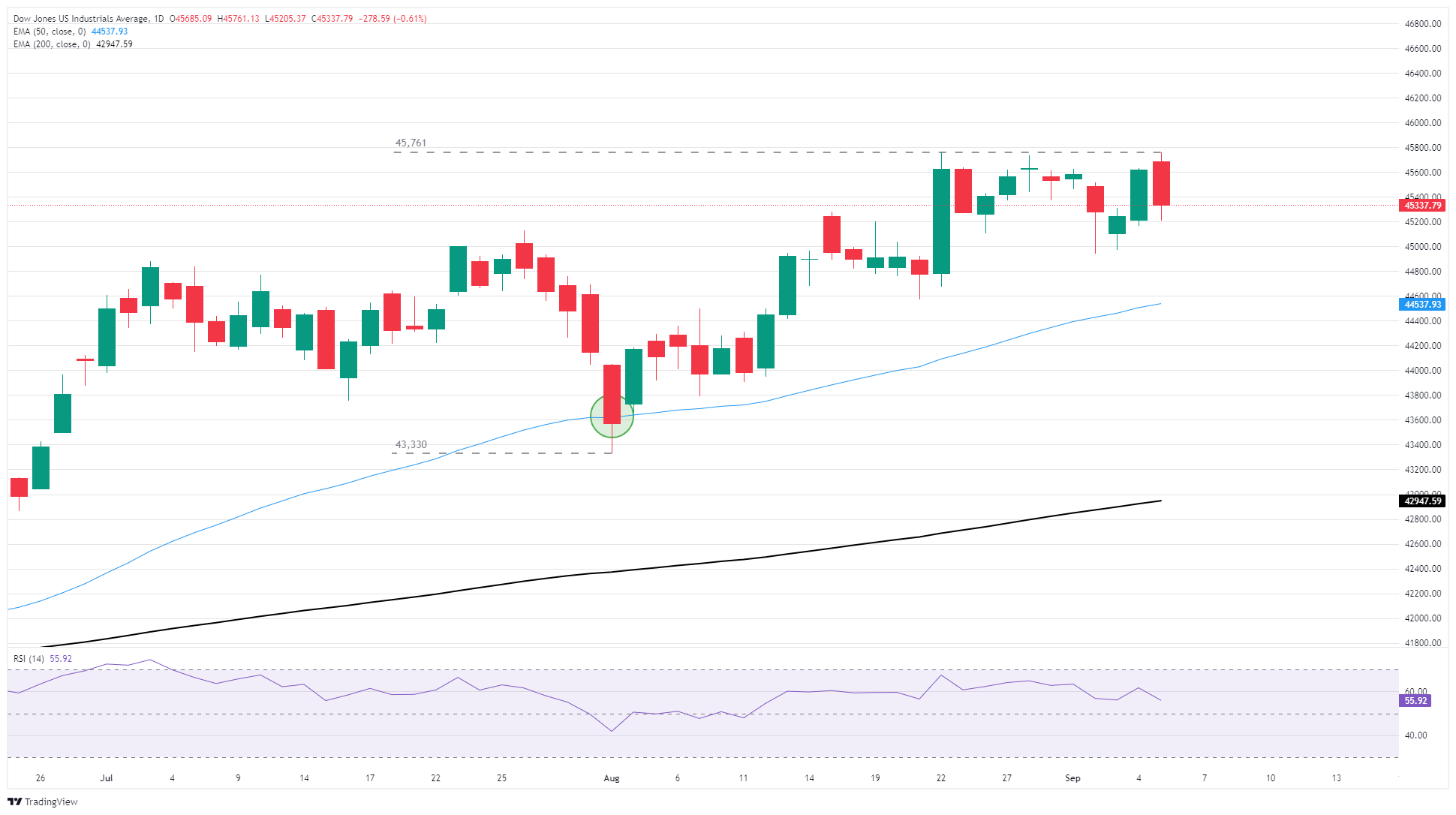 The Dow Jones Industrial Average (DJIA) sank on Friday, falling nearly 500 points at its lowest after United States (US) Nonfarm Payrolls (NFP) data showed the US added far fewer jobs than expected, pinning expectations of a Federal Reserve (Fed) interest rate cut on September 17.
