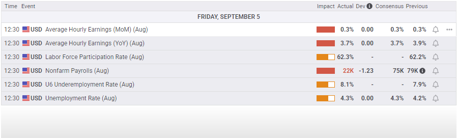 Despite equity traders getting their wish for an underperforming NFP print, the latest round of jobs data has turned into a monkey’s paw scenario. While low hiring figures will help push the Fed into an interest rate cut in a couple of weeks, too low of an NFP figure has reignited recession fears across the broader market. Despite hitting a new all-time high on intraday bids, the Dow Jones has recoiled sharply from record territory, paring away Thursday’s hopeful gains and sending the major equity index back into the red for the week.