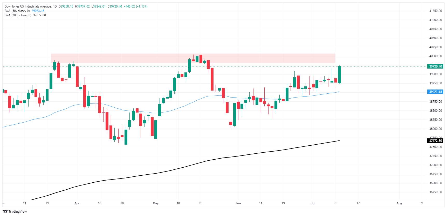 The Dow Jones Industrial Average (DJIA) climbed on Wednesday, gaining over 400 points and testing above 39,550.00 as equity markets stepped back into a risk-on stance. Rate cut hopes continue to underpin broader market flows, and investors have recovered their footing and brushed off an overall cautious tone from Federal Reserve (Fed) Chairman Jerome Powell.