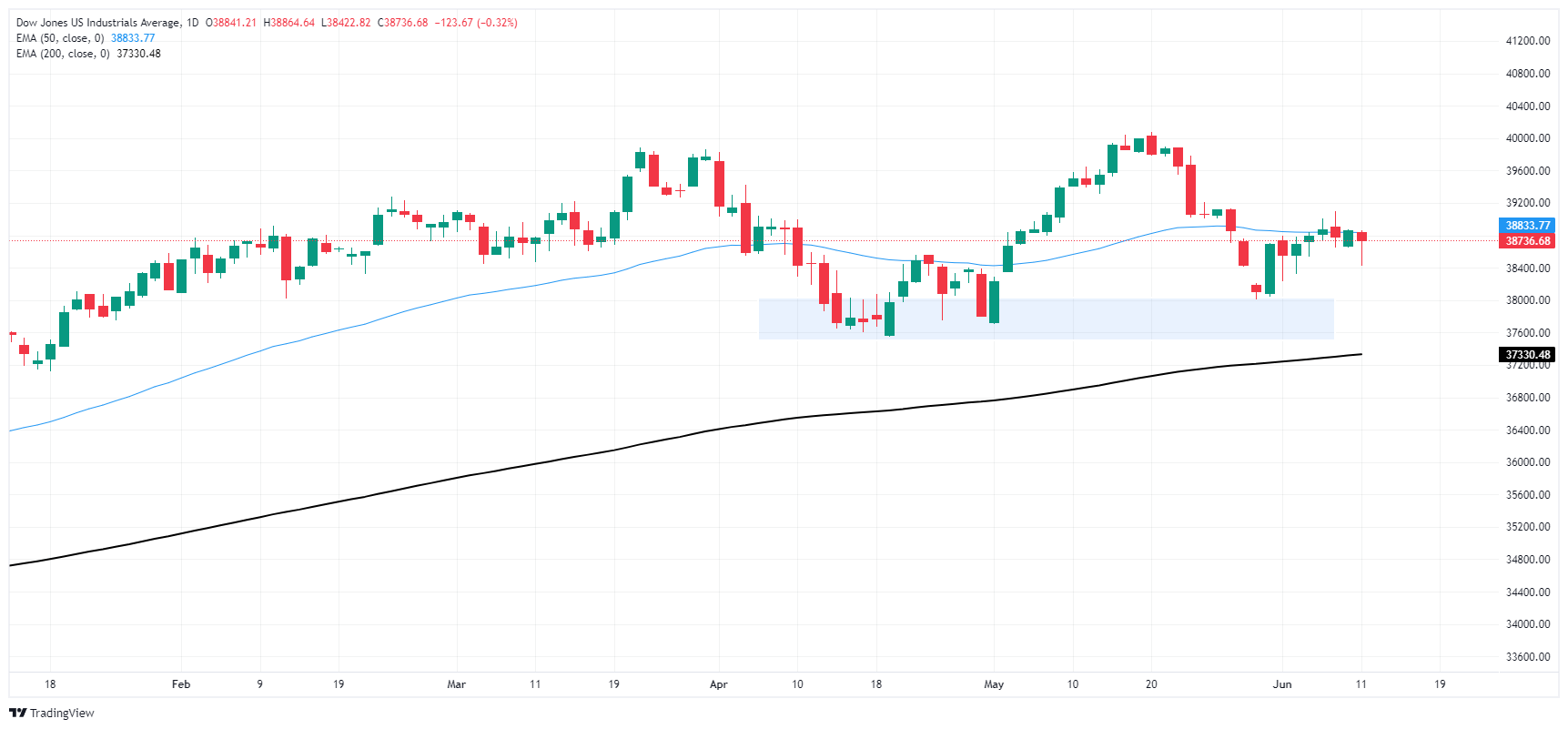 The Dow Jones Industrial Average (DJIA) is struggling under the weight of investor trepidation ahead of Wednesday’s key Federal Reserve (Fed) outing. The Fed is broadly expected to hold rates in the 500-525 basis point range in June and July, but investors are worried that 2024 may see even less rate cuts than previously expected. The Fed’s “dot plot” of Interest Rate Expectations will be updated on Wednesday, and a fresh update on US Consumer Price Index (CPI) inflation will also drop on markets.