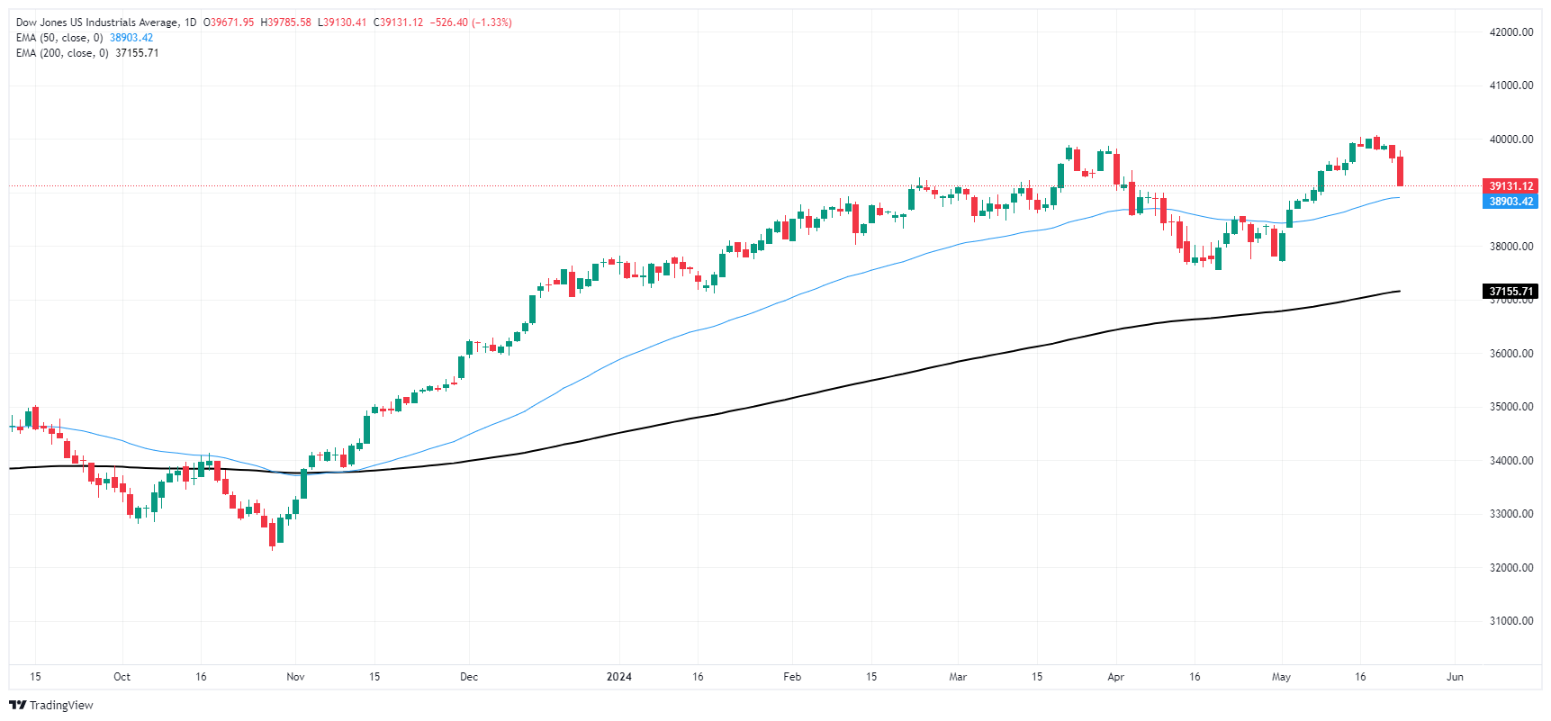 The DJIA is slipping back towards the 50-day Exponential Moving Average (EMA) at 38,908.36. Despite near-term declines, the index is still buried deep in bull country, with the index trading well above the 200-day EMA at 37,141.05.