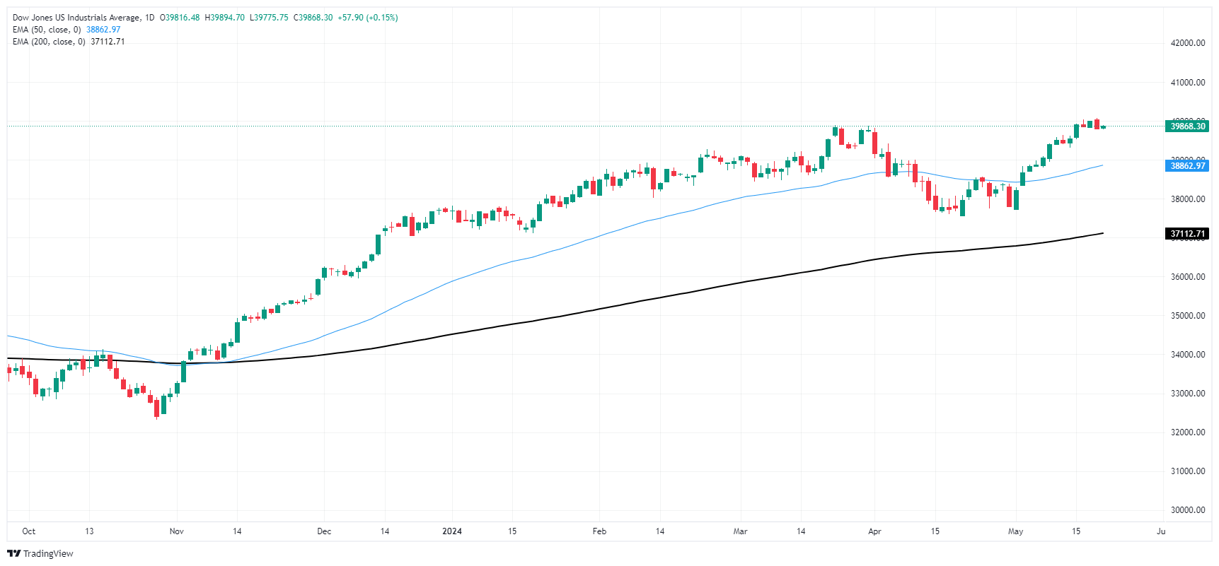 The Dow Jones Industrial Average (DJIA) pushed above 39,800.00 on Tuesday as Federal Reserve (Fed) policymakers try to apply downward pressure to broad-market rate cut expectations. Fed officials noted on Tuesday that the Fed isn’t likely to cut rates until they get more data pointing to a consistent easing of inflation to the Fed’s 2% annual target. Despite an easing in inflation data for April, central planners remain spooked after inflation data from the overall first quarter failed to show disinflation has taken permanent hold.
