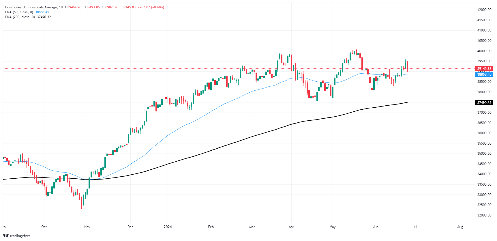 Daily candlesticks continue to grind out chart paper just north of the 50-day Exponential Moving Average (EMA) at 38,864.49, with long-term technical support from the 200-day EMA at 37,455.71. Despite holding in bull country, the Dow Jones has struggled to make firm gains after a -5.15% backslide from all-time highs above 40,000.00 reached in mid-May.
