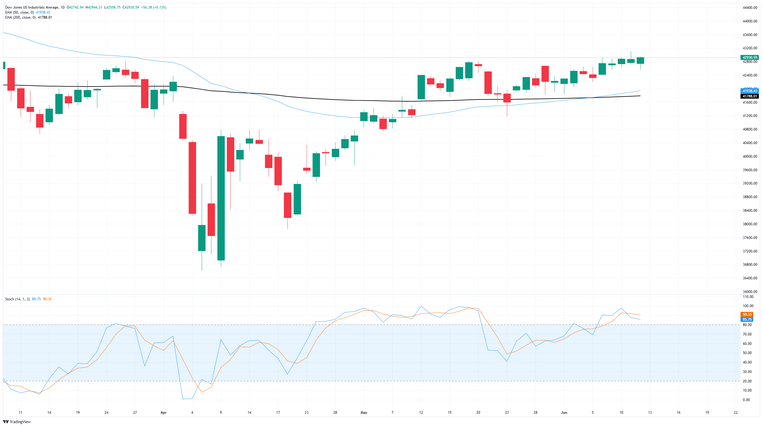 Thursday’s bullish push is keeping the Dow Jones Industrial Average within touch range of the 43,000 major price handle, but meaningful momentum remains limited. Price action continues to get mired in a recent congestion zone, and the major equity index is struggling to put distance between bids and the 200-day Exponential Moving Average (EMA) near 41,780.