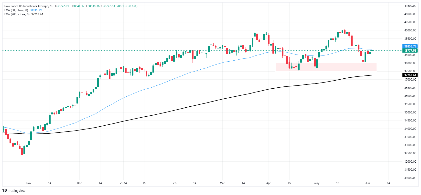 Daily candlesticks are knocking on a supply zone below 38,000.00, and long-term technical support is priced in at the 200-day Exponential Moving Average (EMA) at 37,297.33. The Dow Jones has arrest a near-term decline, but still remains down -3.35% from record high bids set in mid-May.