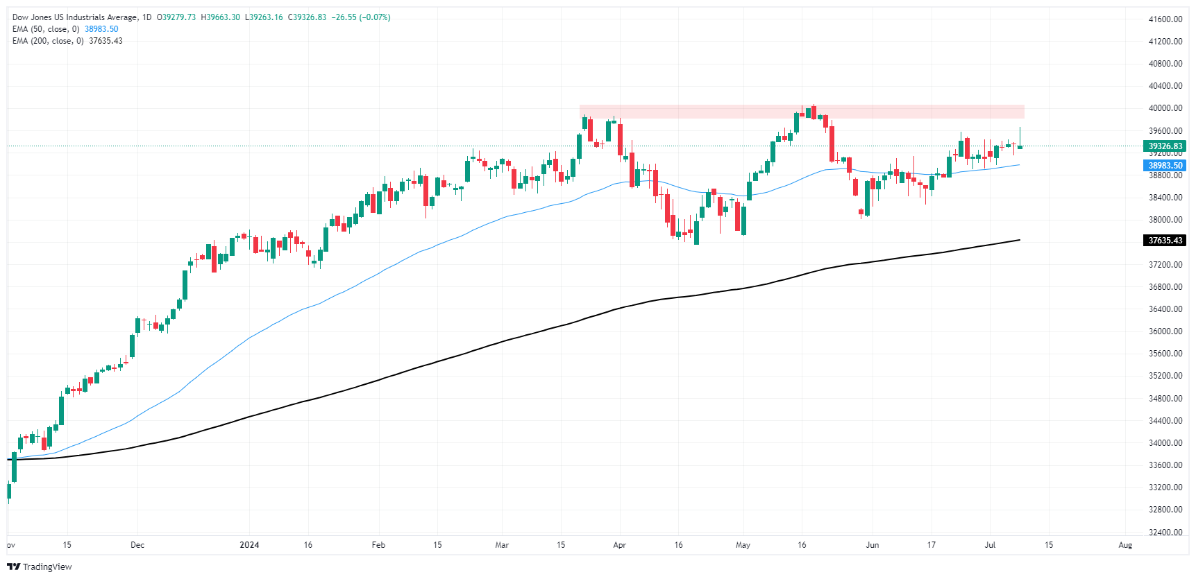 The Dow Jones has churned in familiar chart territory just above the 50-day Exponential Moving Average (EMA) at 38,983.20 since recovering from late May’s bottom near 38,000.00. Despite holding firmly in the high end, bullish momentum remains limited, and Dow Jones bidders have so far failed to develop the necessary momentum to drag bids back over all-time highs set above the 40,000.00 major price handle.