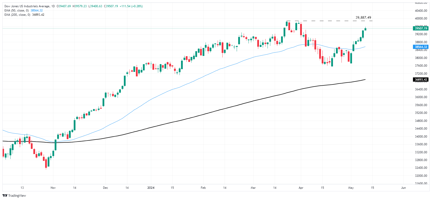 Despite hobbled risk appetite in broader markets, the Dow Jones managed to set a new peak for the week, trading into 39,579.23 before settling back to the 39,500.00 region. Top side momentum is set to stall with the Dow Jones appearing overextended. The major equity index is trading well above the 200-day Exponential Moving Average (EMA) at 36,893.00.