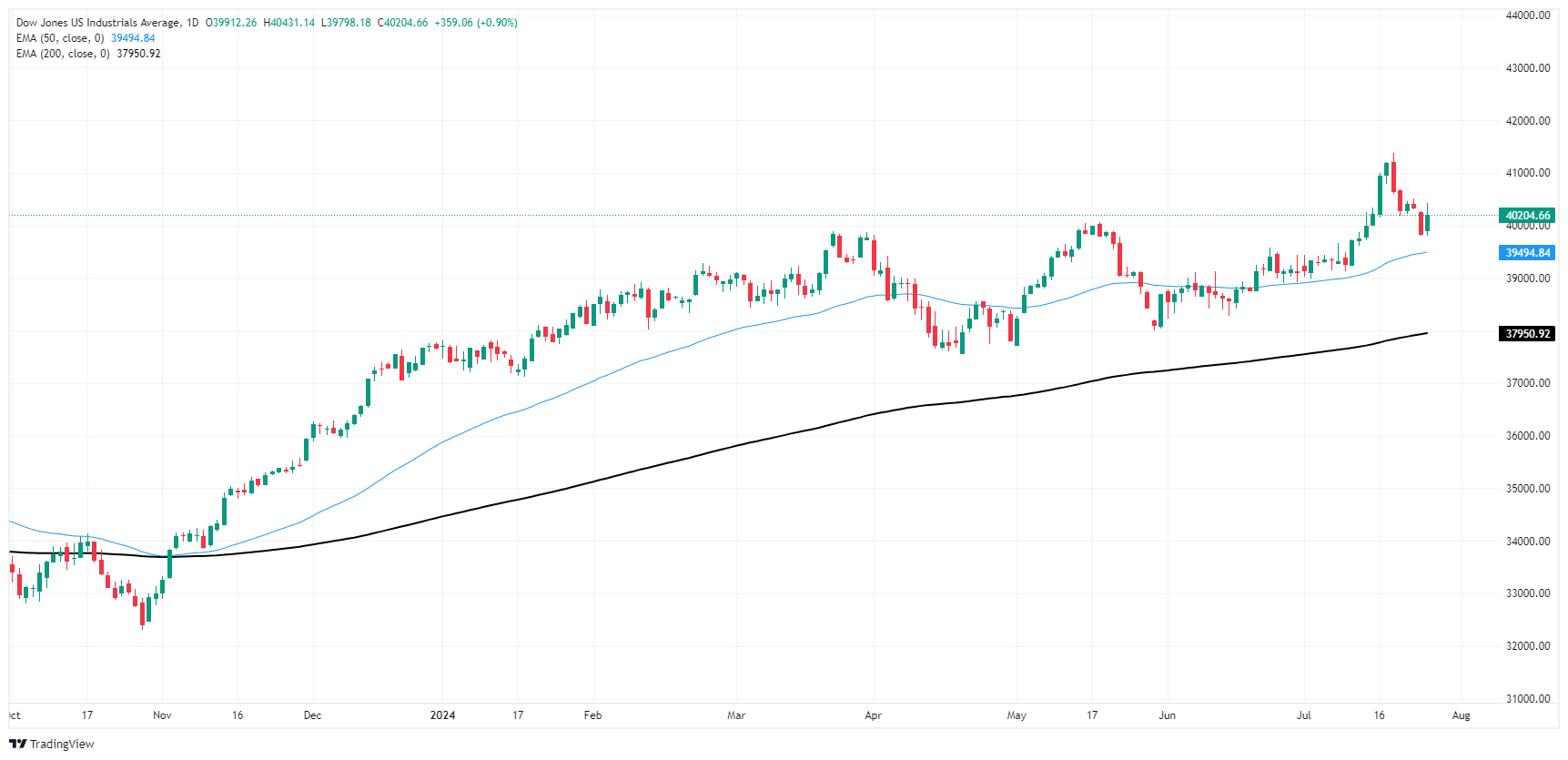 The Dow Jones climbed around 400 points on Thursday before settling back to a healthy 200-point gain, gaining over nine-tenths of one percent and clambering back over the 40,000.00 major price handle as stocks pile back into risk-on bets after the previous day’s sharp decline that saw the Dow Jones shed around 500 points in a single day.
