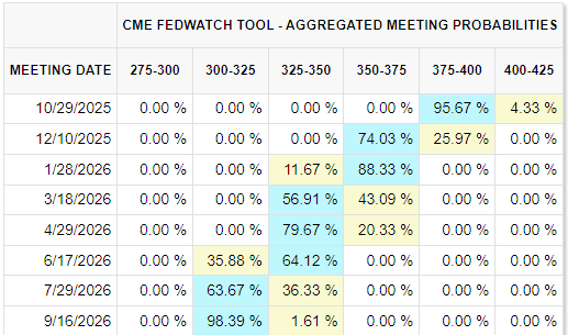 According to the CME’s FedWatch Tool, rate traders are pricing in 95% odds of a follow-up interest rate trim on October 29. However, the jury is still out on a third rate cut: Although rate markets see nearly 75% of a third-straight rate cut in December, many investors are blinking at the prospect and expect the Fed may hold in December before delivering a third cut in January.