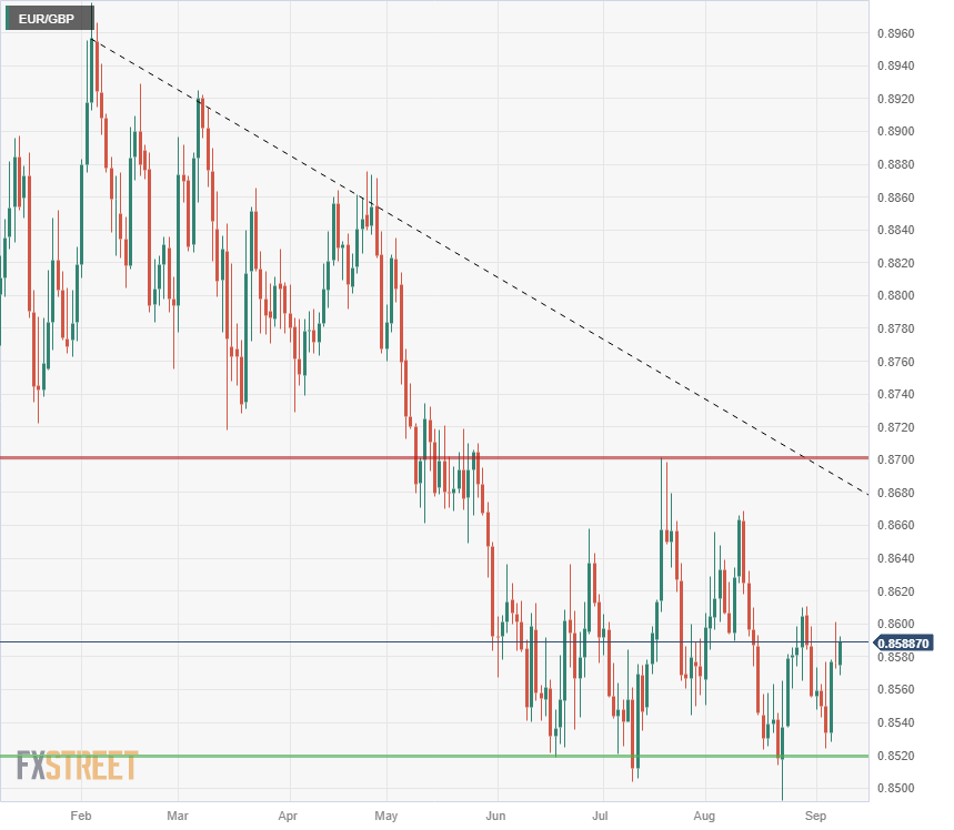 The Euro-Pound pair has consolidated since June, cycling in a rough range between 0.8660 and 0.8520. A high-side resistance zone sits above, between 0.8740 and 0.8720, while any significant downside breaks could see the floor give way beneath the 0.8500 major handle.