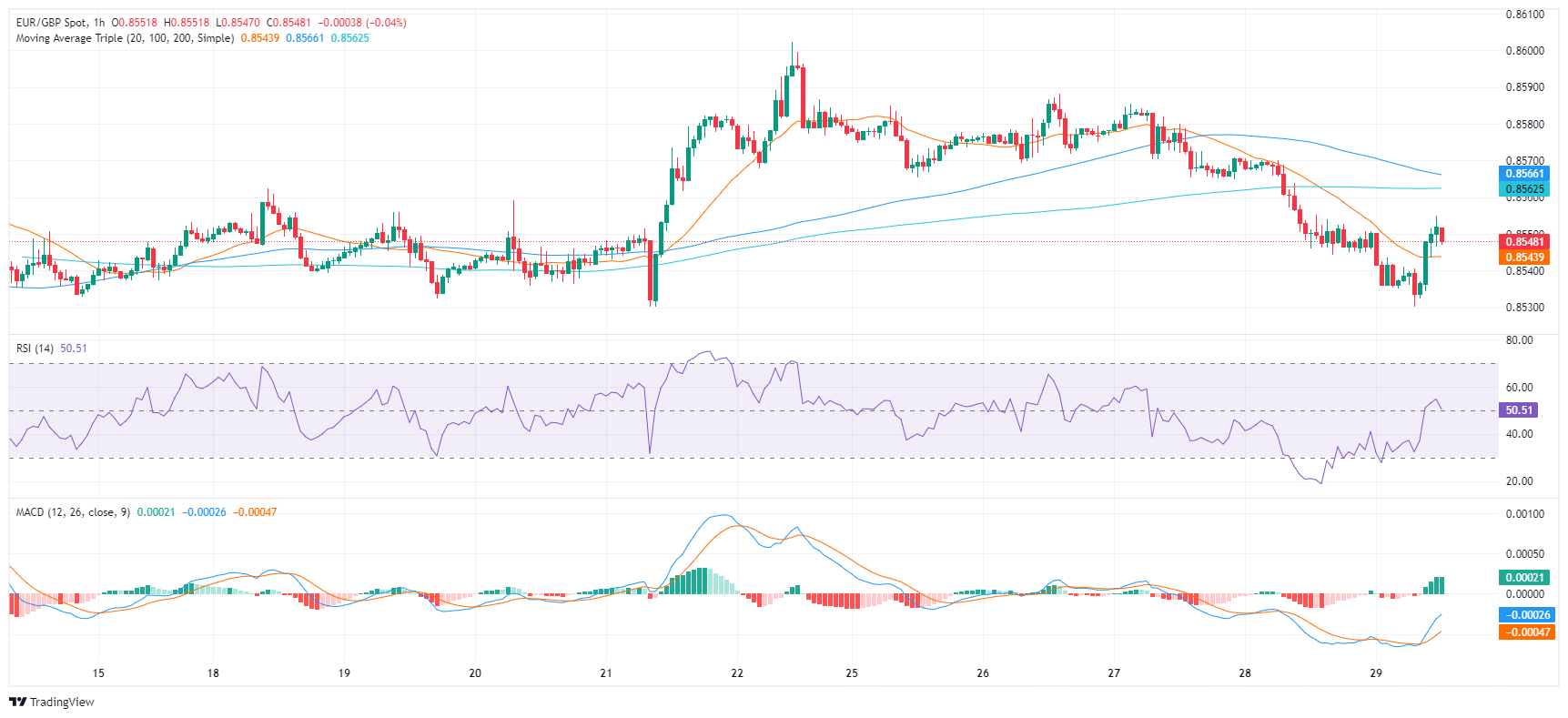 The EUR/GBP pair is currently trading at 0.8550, with minor losses on Friday’s session. The sellers are exerting their presence as bullish momentum remains weak and the fact that the cross remains below its main Simple Moving Averages (SMAs) of 20,100 and 200-days contributes to the bearish bias.