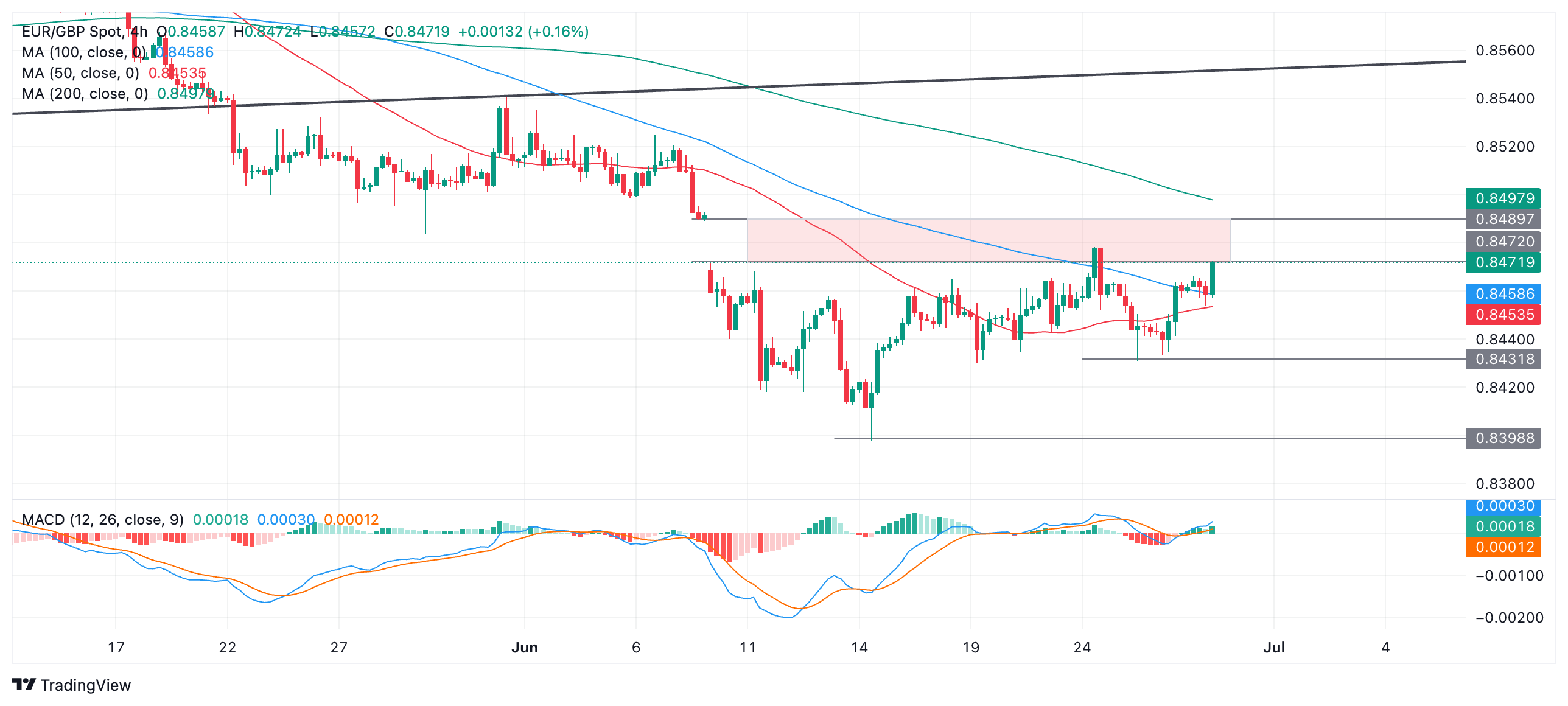 EUR/GBP has corrected back after bottoming on June 14 at the 0.8398 lows.