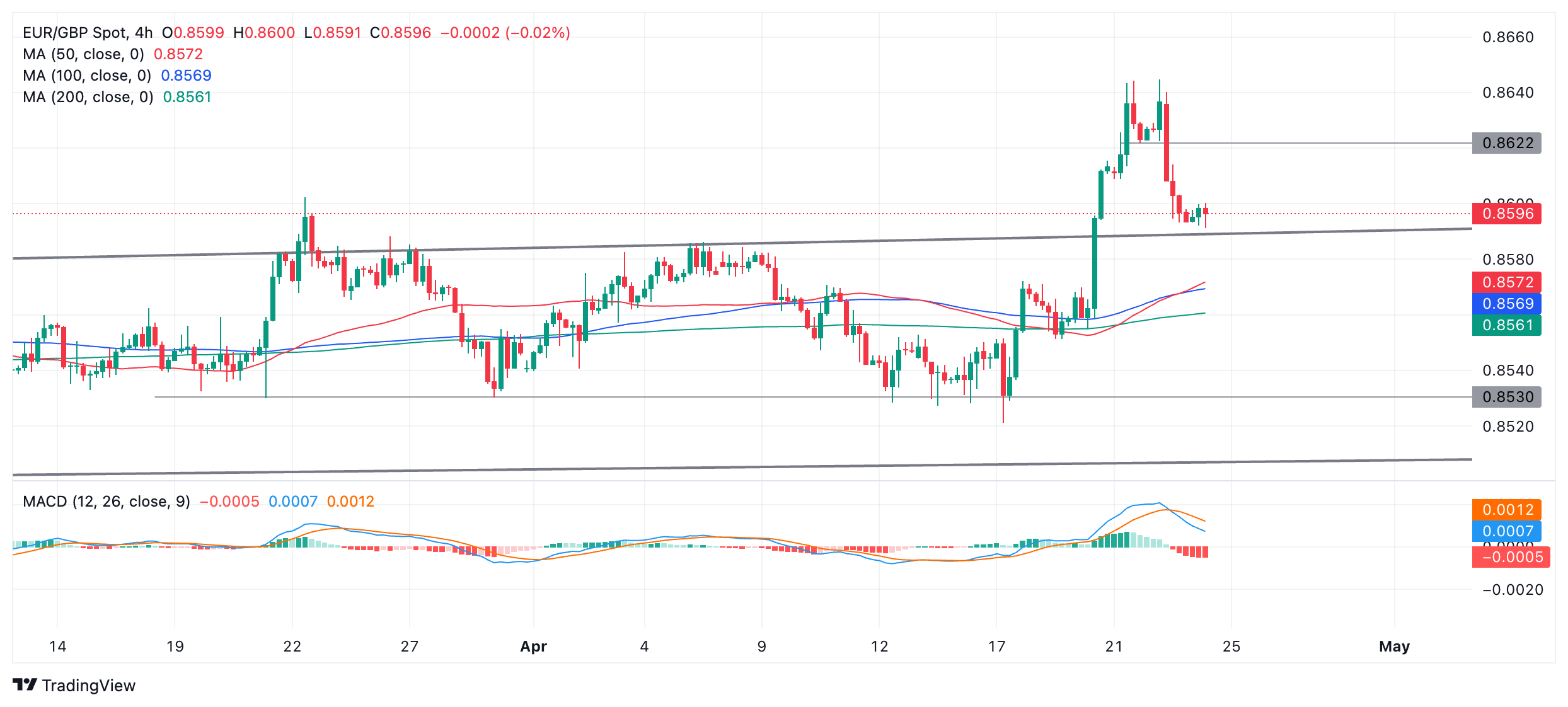 EUR/GBP price has reversed and fallen to a key support level at around 0.8590, where it is currently consolidating.