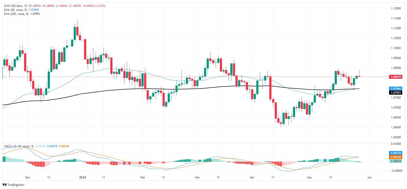 EUR/USD is cycling in familiar technical congestion, but a hidden bullish divergence of the Moving Average Convergence-Divergence (MACD) implies the pair could be primed for a push higher if bidders are able to springboard off of the 200-hour Exponential Moving Average at 1.0844.