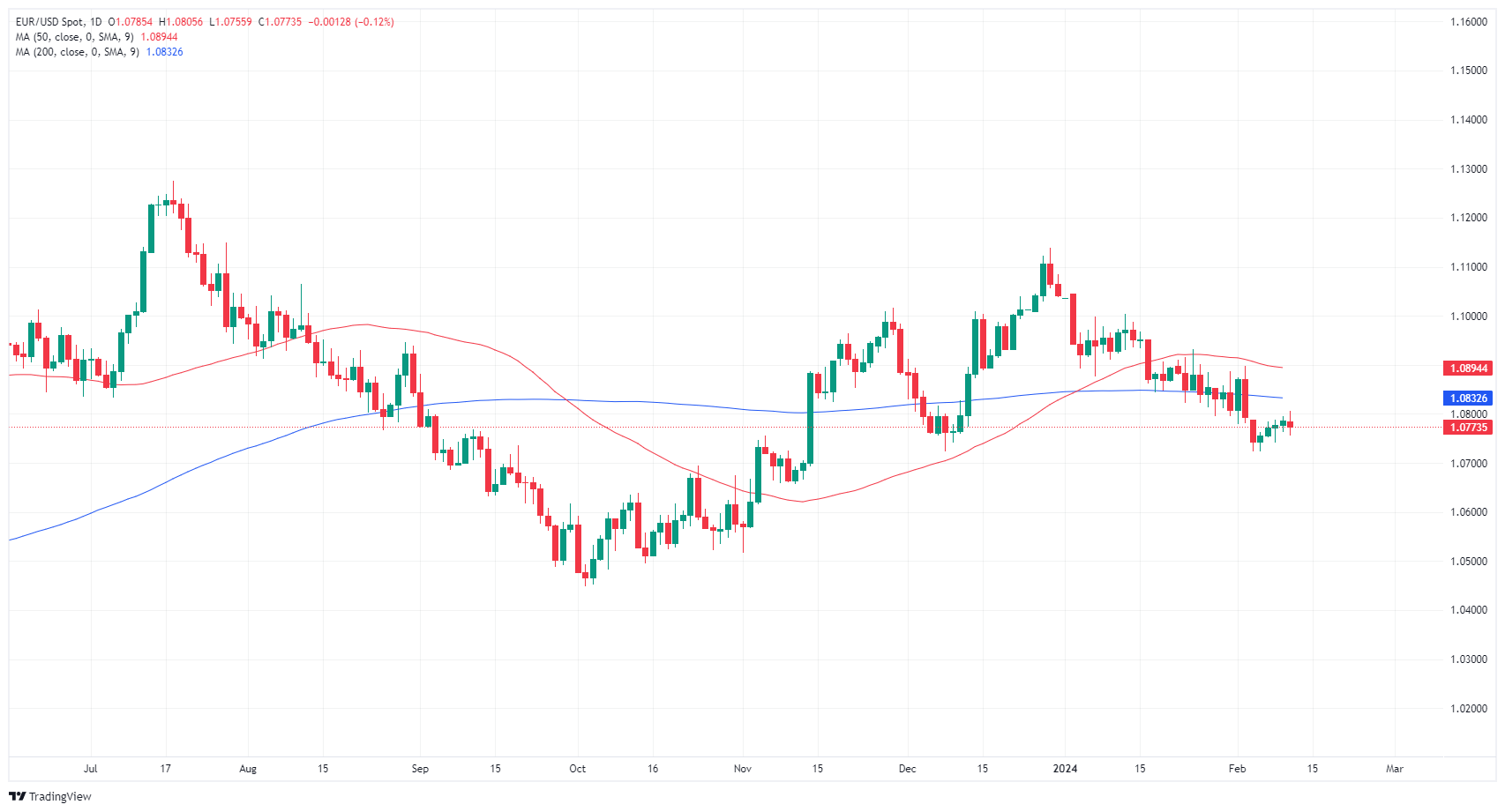 Despite four straight days of gains for the EUR/USD, the pair remains on the bearish side of the 200-day SMA near 1.0830. The EUR/USD remains down over 3% from December’s peak bids near 1.1150, and a bearish trend sees little topside potential for the pair as the 50-day SMA turns bearish and is set for a downside crossover of the 200-day SMA.