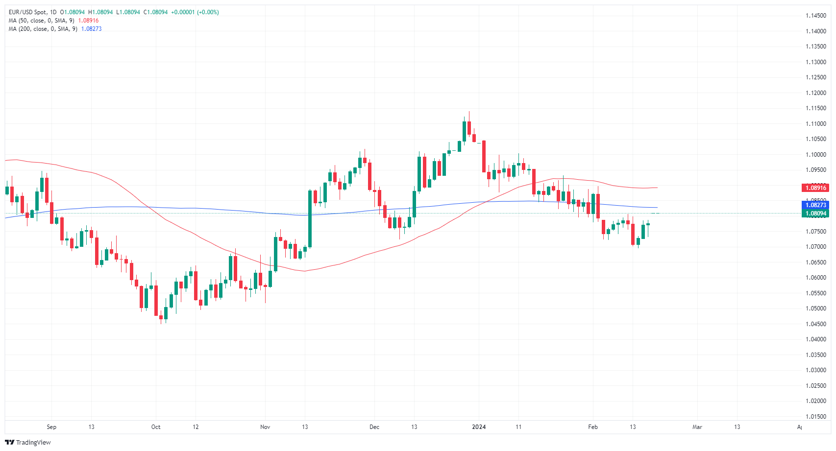 EUR/USD remains trapped on the bearish side of the 200-day SMA at 1.0830, and the pair’s recent descent into 1.0700 represents the EUR/USD’s lowest bids since November. The pair is set for a fifth consecutive bullish close but is still down around 3% from December’s peak at 1.1140.