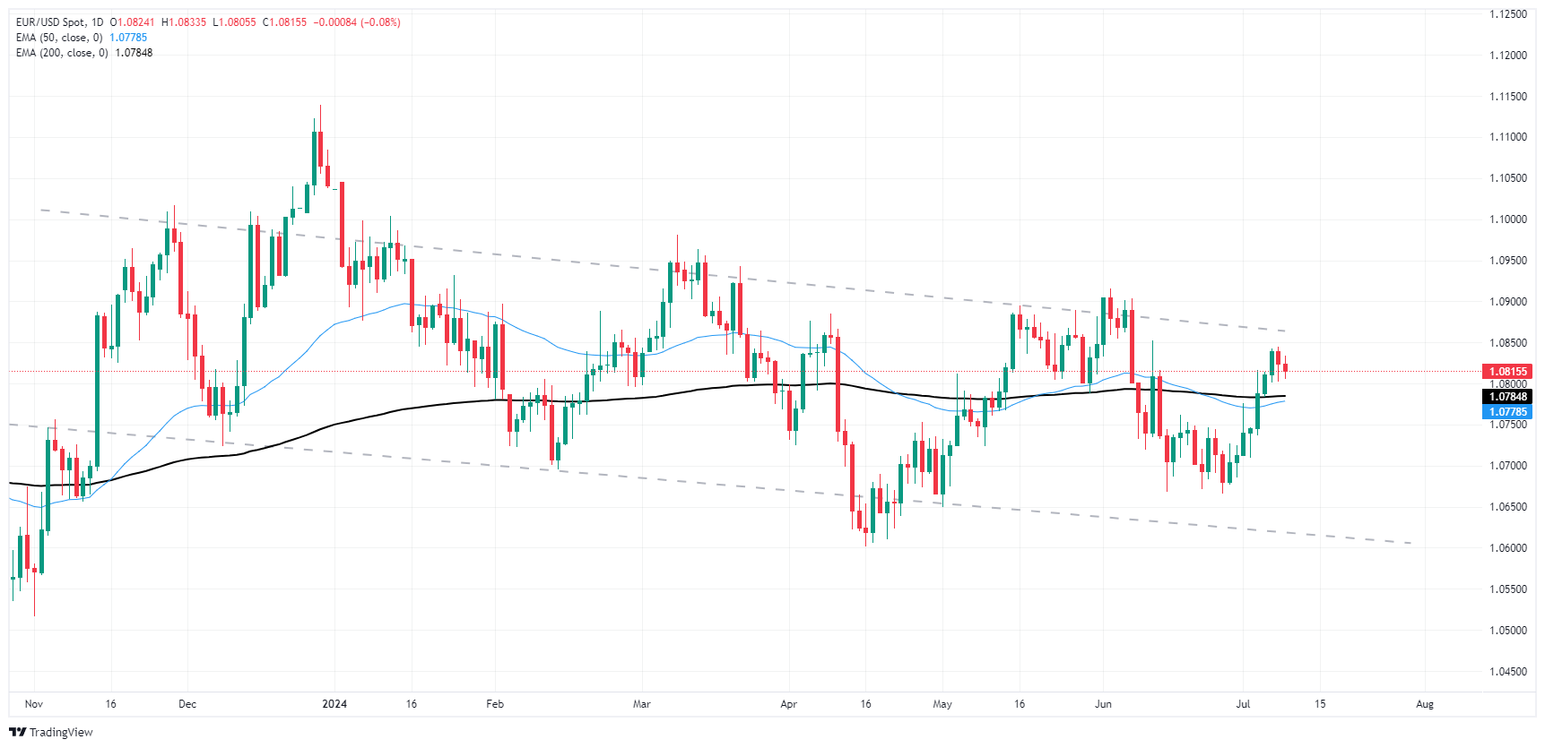 EUR/USD continues to settle closer to 1.0800 after a misfire in market expectations of Federal Reserve (Fed) Chairman Jerome Powell’s testimony before US Congress on Tuesday. Despite a head nod to improving inflation figures, the Fed is still leaning firmly in a cautionary stance, pulling the rug from beneath markets that were coiled in anticipation of a tonal shift from Fed policymakers.