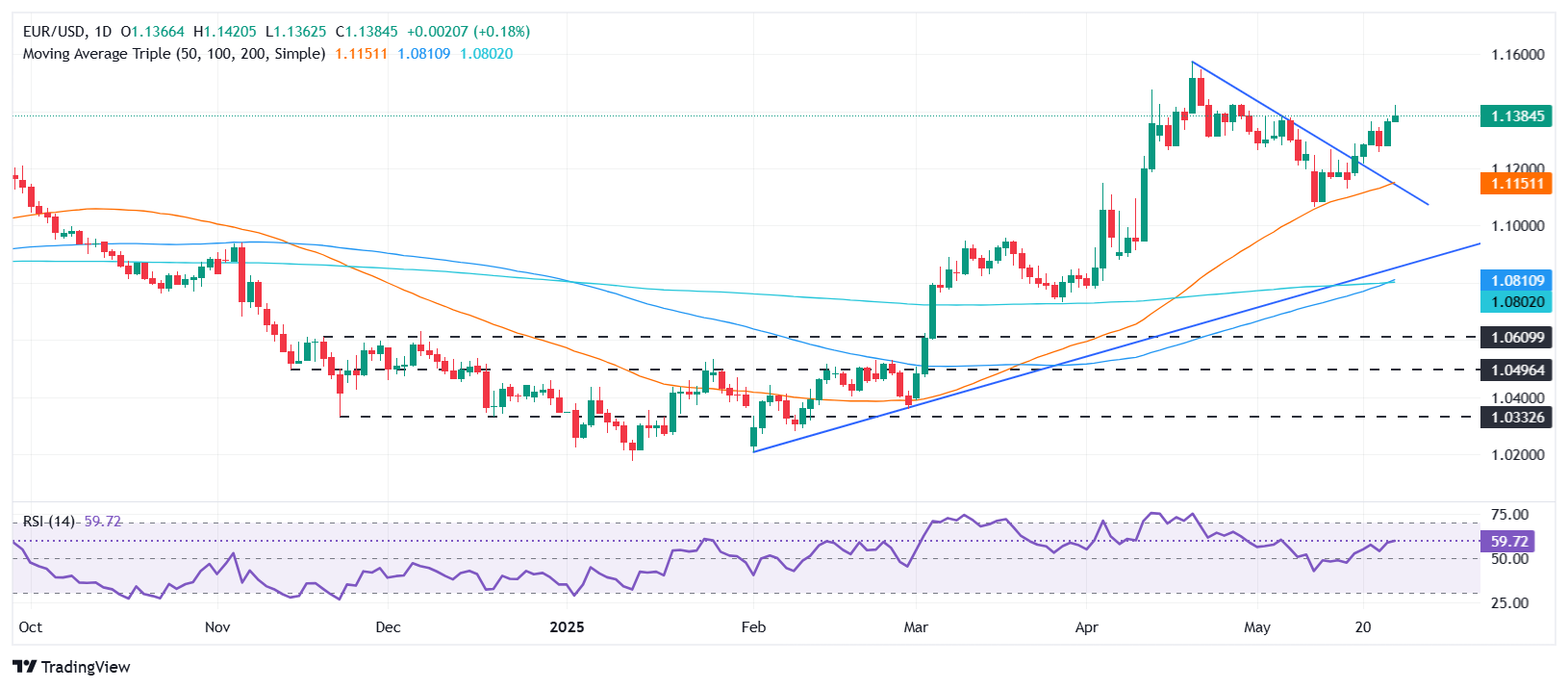 EUR/USD begins the week on the front foot but trims some of its earlier gains after hitting a four-week high of 1.1420, sponsored by US President Donald Trump’s reversal on his decision to enact tariffs on the European Union (EU) on June 1. At the time of writing, the major currency trades at 1.1380, up 0.20%.