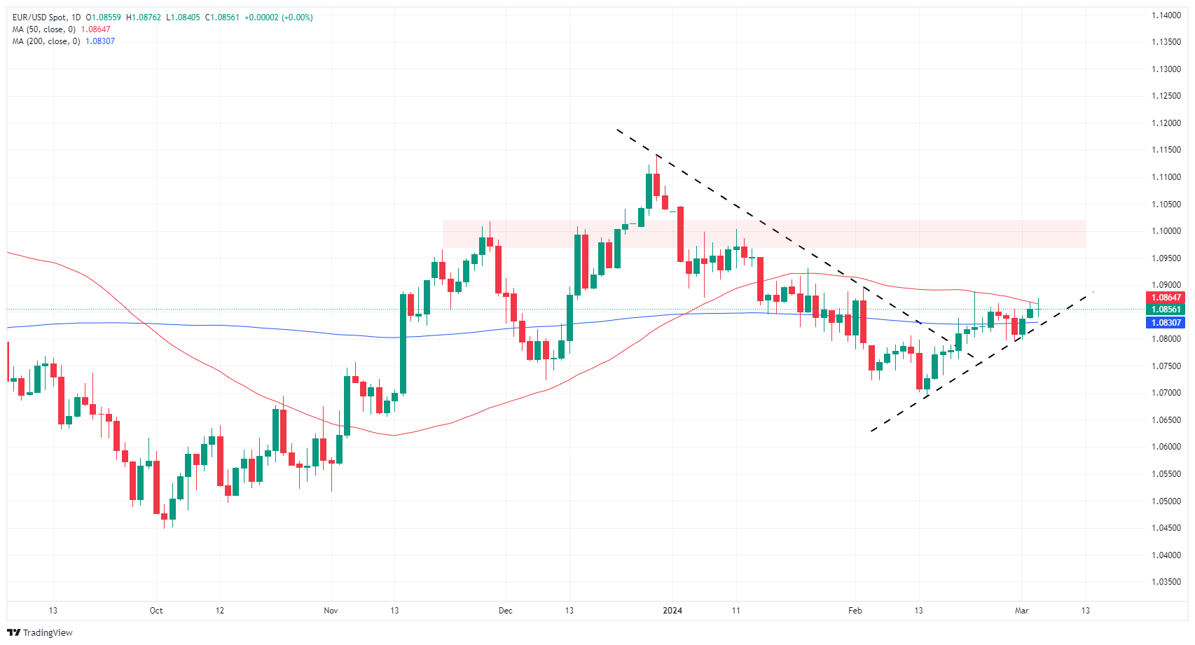 EUR/USD continues to struggle to find adequate bullish momentum to peel the pair off its 200-day Simple Moving Average (SMA) at 1.0830, and intraday bids are stuck near 1.0850. Topside gains are capped by a 50-day SMA grinding into a congestion pattern with the 200-day SMA.