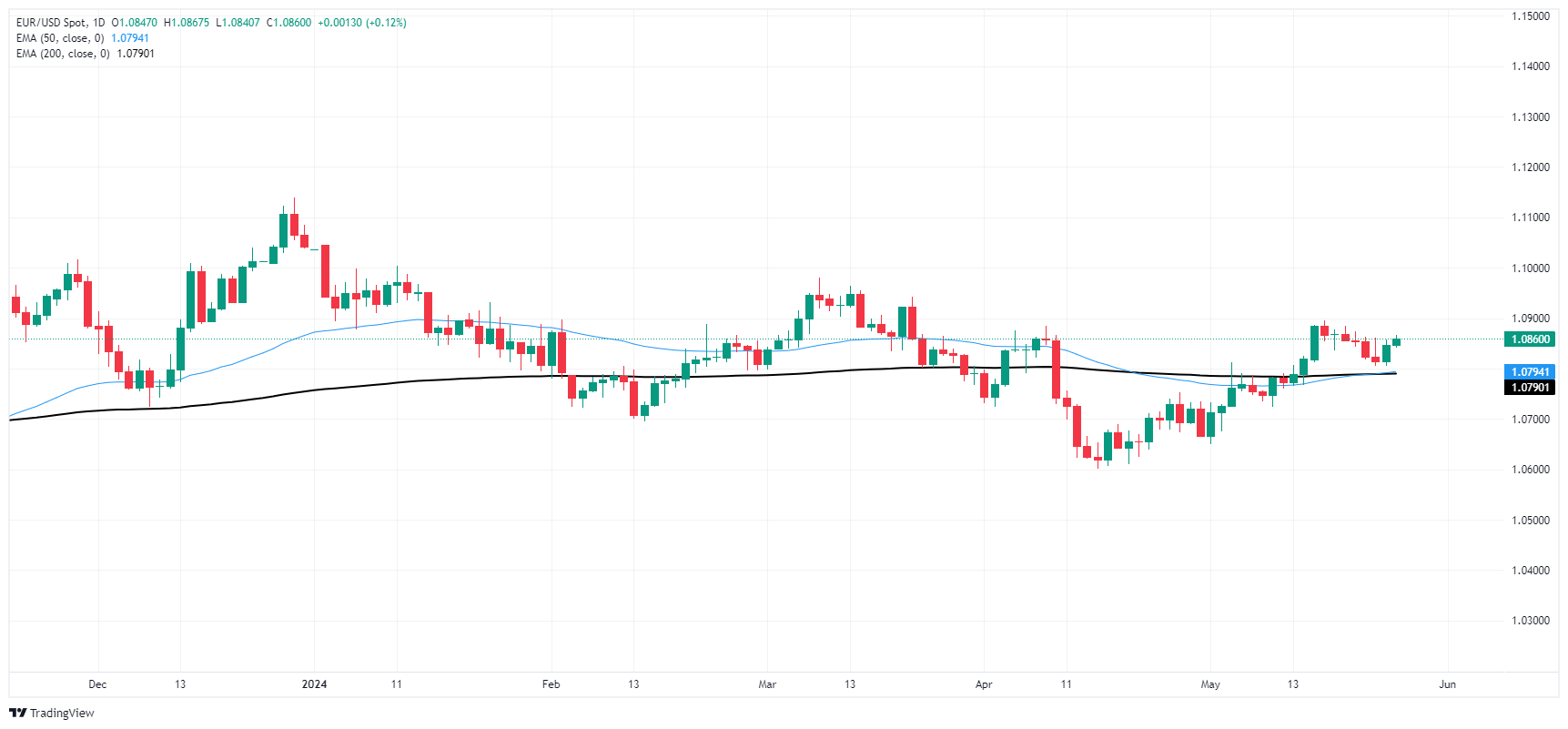 EUR/USD found little momentum on Monday, cycling near 1.0860 after US markets were dark for the holiday long weekend. Tuesday will kick off the Fiber’s trading week in earnest after German sentiment surveys hobbled the Euro (EUR) on Monday.
