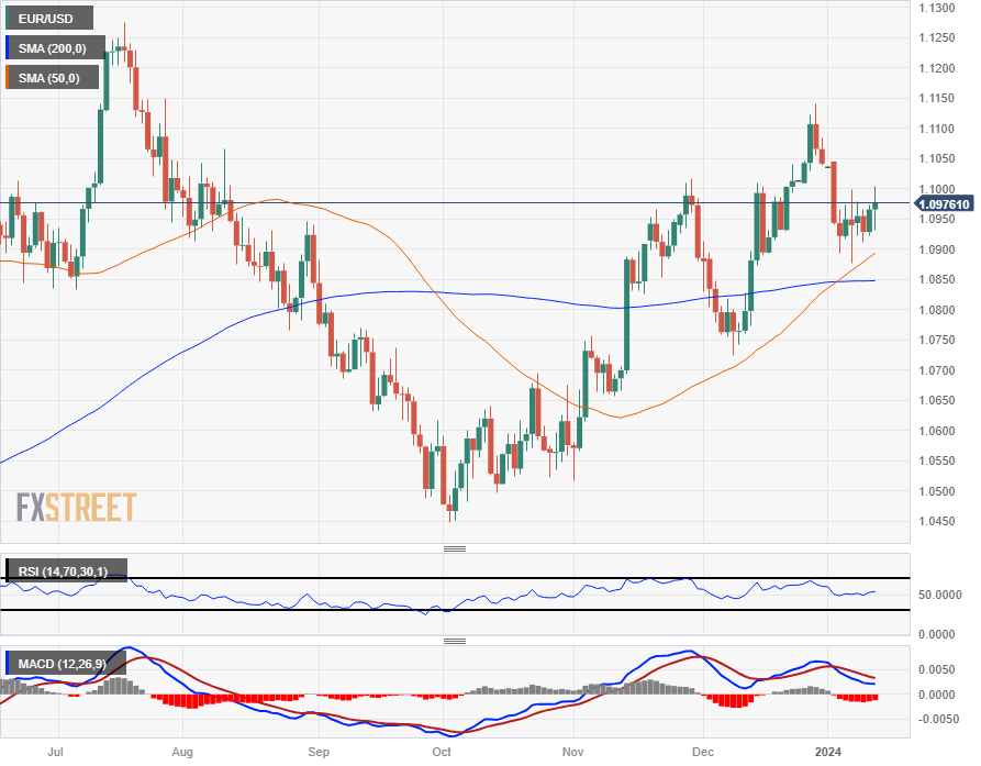 The EUR/USD hoisted itself into the 1.1000 handle early Thursday, setting a new 2024 high of 1.1004 before getting slapped down to trade back into 1.0950. The pair has slid back into near-term congestion at the 200-hour Simple Moving Average (SMA) near 1.0960.