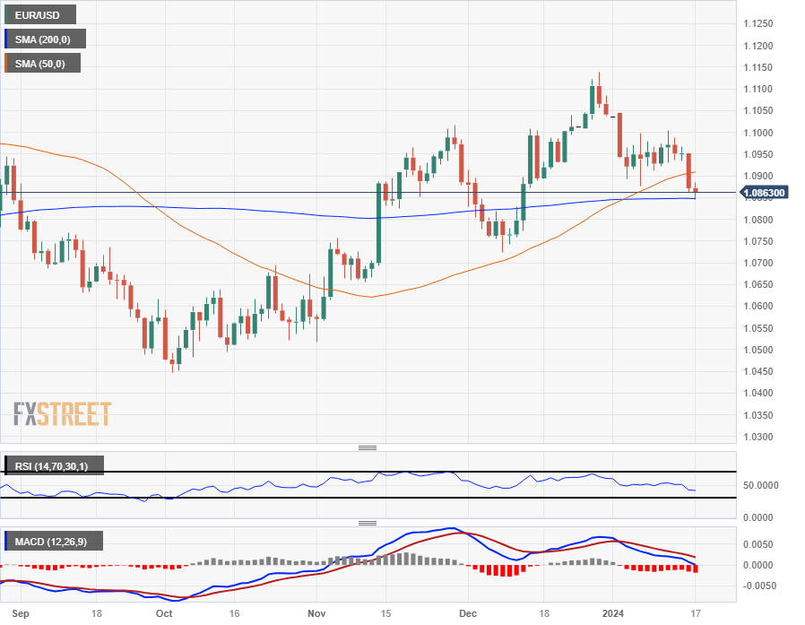 The EUR/USD tumbled into the 1.0850 region in intraday action on Wednesday, getting pushed further away from the 200-hour Simple Moving Average (SMA) near 1.0940. The pair is testing into one-month lows, down about 1.3% from early January’s test into the 1.1000 major handle.