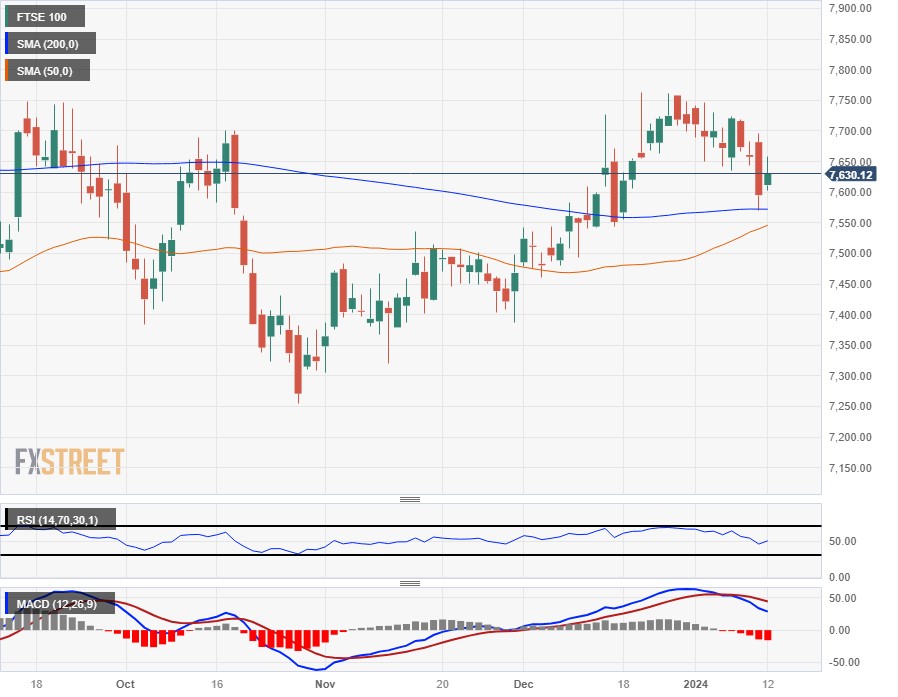Despite a moderate gain on Friday, the FTSE 100 major London equity index is still off of recent highs, down from late December’s seven-month high of £7,763.54, slipping back into the 200-day Simple Moving Average (SMA) near £7,572.