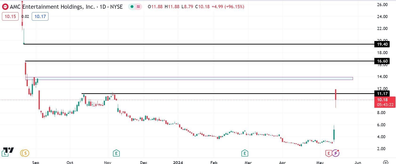 AMC stock has formed a new range high on Tuesday with a push above the $11.17 high from October and November of last year. Above there is a demand window ranging from $13.50 to $13.90.