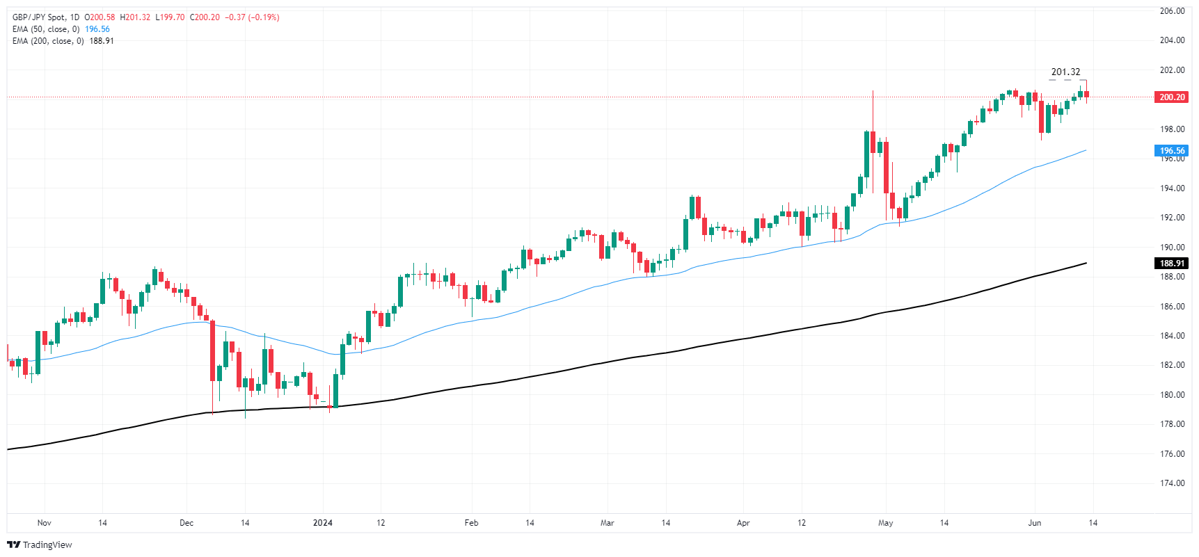 GBP/JPY peaked at a fresh 16-year high of 201.32 early Thursday before quickly pulling back to the 200-hour Exponential Moving Average (EMA) at 199.89. The pair is still tilted firmly into bullish territory, but downside pulses are keeping the pair in a choppy rising consolidation pattern.