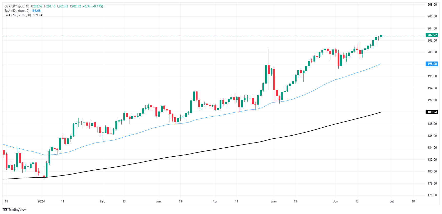 Daily candlesticks have churned out an eighth consecutive gain as the Guppy continues its march towards 204.00. The pair is up 13% in 2024, and has closed in the green for six straight months.